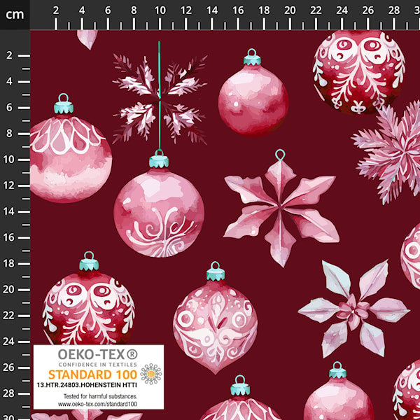 Mit diesem edlen Baumwolljersey hält der Weihnachtszauber stilvoll Einzug in Deine Nähstube. Die detailreich illustrierten Weihnachtskugeln in warmen Rosé-, Pink- und Beerentönen leuchten auf einem tiefen Weinrot wie kleine Schmuckstücke – elegant, festlich und voller Wintercharme. 💖✨