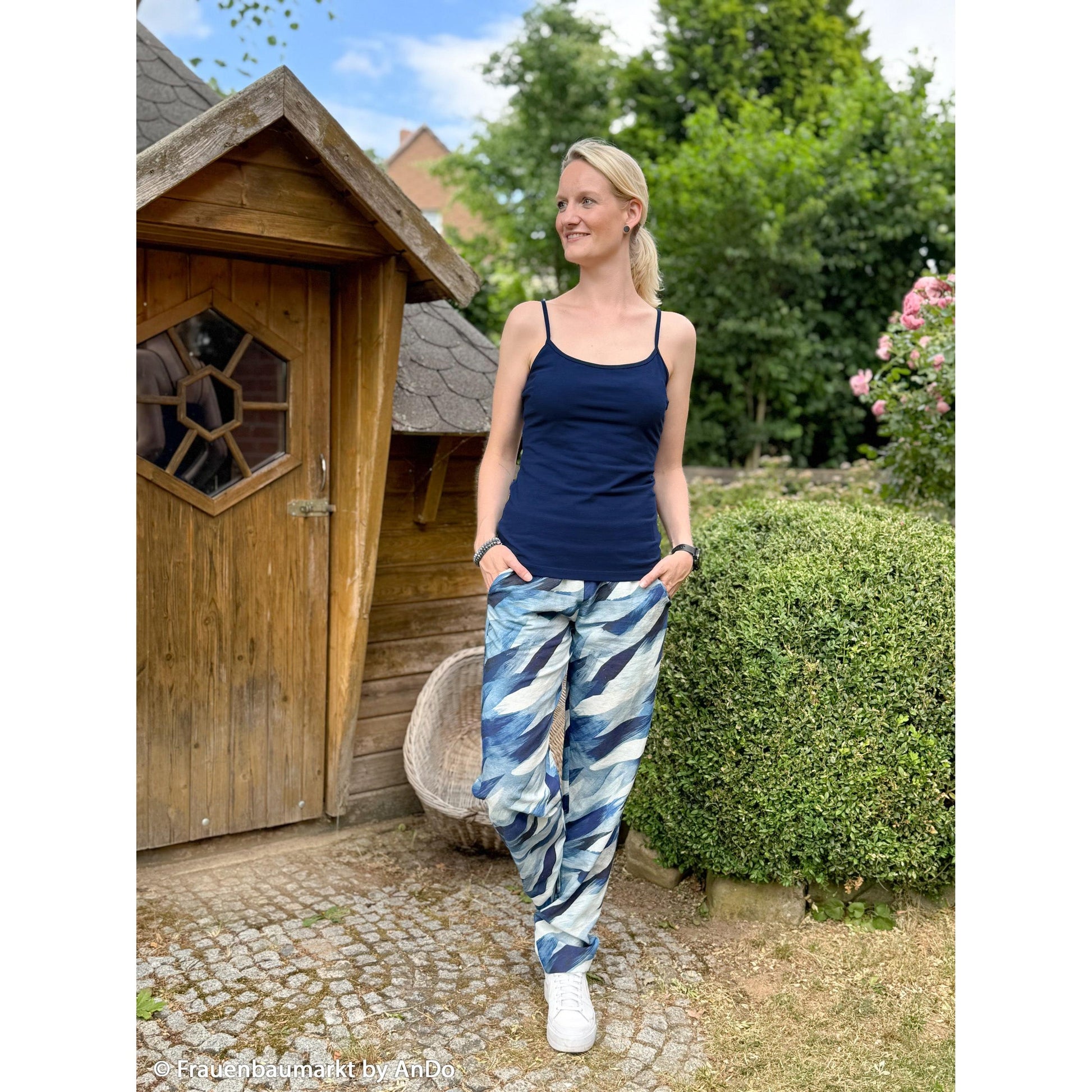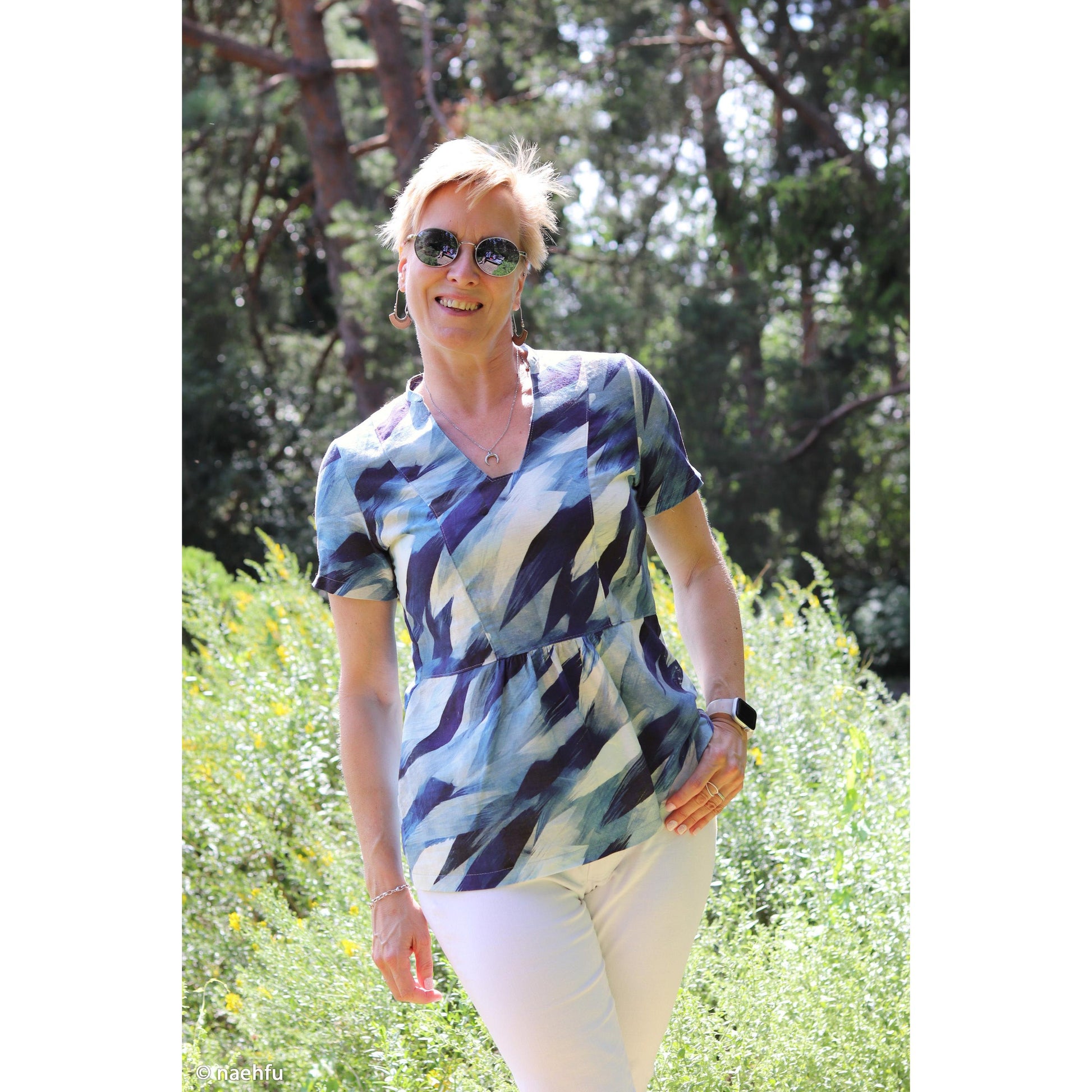 Die aquarellartigen Pinselstriche in Blau auf hellem Grund wirken lebendig und ruhig zugleich – fast wie ein Blick aufs Wasser vom Steg aus. „Adria“ bringt sofort Sommerstimmung ins Nähzimmer und macht aus schlichten Schnitten echte Lieblingskleidung.