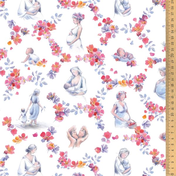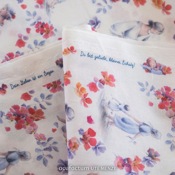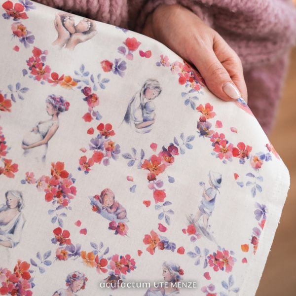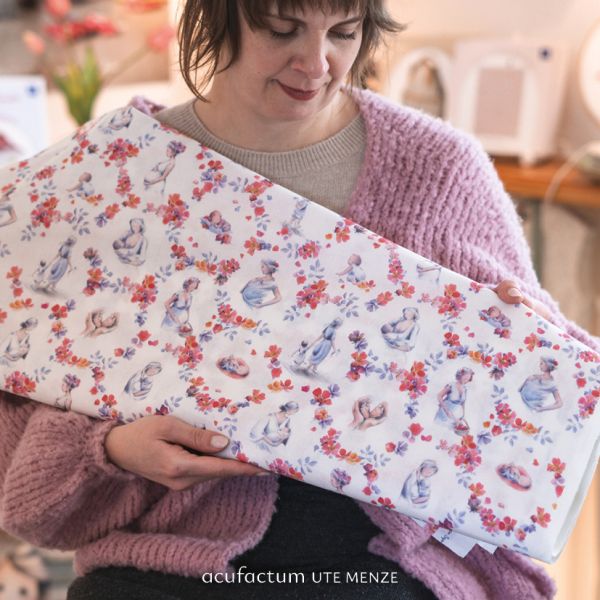 Die liebevollen Illustrationen von Sophia Drescher zeigen das wohl größte Abenteuer des Lebens: das Ankommen eines kleinen Menschen. Eine werdende Mama, die sanft ihren Bauch hält. Eine Mutter, die ihr Baby im Arm wiegt. Ein neugieriges Krabbelkind auf Entdeckungstour. Umrahmt von harmonischen Blüten in ruhigen Blau- und warmen Rottönen entsteht ein Stoff, der nicht laut ist – sondern tief berührt.