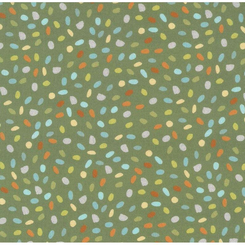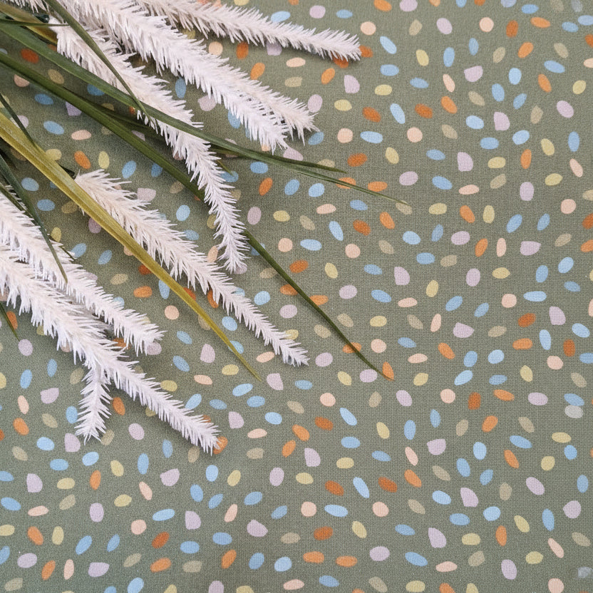 Manchmal sind es die kleinen Dinge, die ein Design besonders machen – wie diese fröhlich verteilten, bunten Tupfen auf sattem Olivgrün.