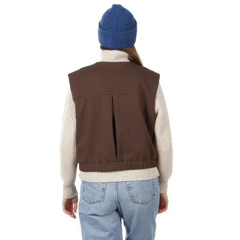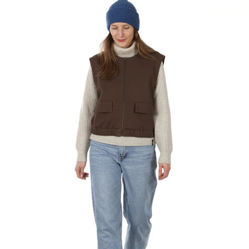 Der Reißverschluss macht sie alltagstauglich und unkompliziert, während die aufgesetzten Taschen mit Klappen den markanten Utility-Style unterstreichen. Durch das Futter trägt sich die Weste besonders angenehm und wirkt hochwertig verarbeitet. Ein schönes Detail ist das Rückenteil mit Passe und Falte: Es gibt zusätzliche Weite und sorgt für einen lockeren, fließenden Fall. Der Gummibund am Saum bringt die Form wieder zusammen und rundet den Look perfekt ab.