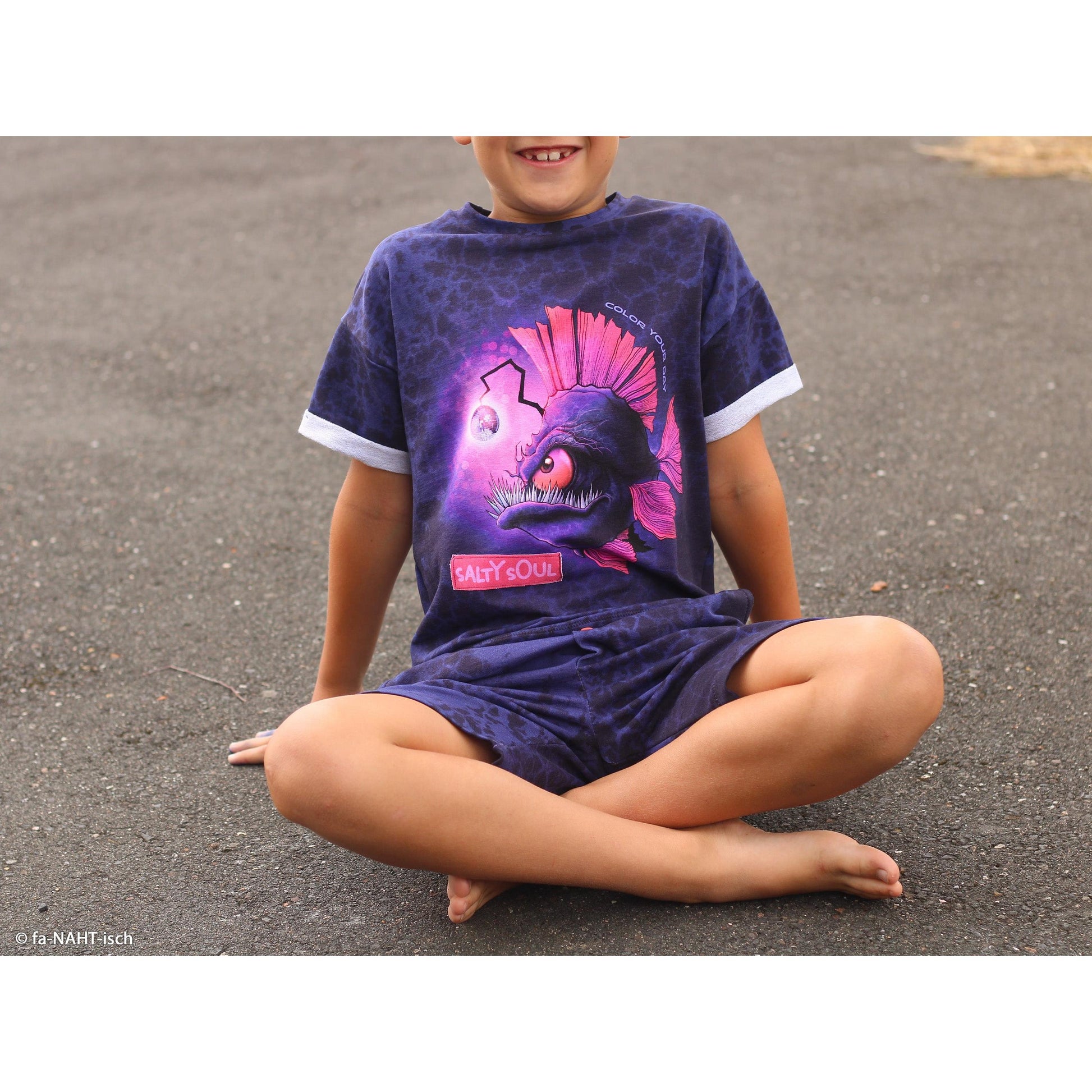 Dieses Panel ist kein Stoff – das ist eine Bühne. Mitten in der dunklen Tiefe taucht der geheimnisvolle Anglerfisch auf und bringt sein eigenes Leuchten gleich mit. Das intensive Farbspiel auf dem tiefdunklen Hintergrund wirkt fast wie ein kleines Kunstwerk und macht aus einem einfachen Schnitt sofort ein echtes Lieblings-Teil. Genau der Stoff für alle, die nicht „noch ein Shirt“, sondern ei "It- Peace" nähen möchten.