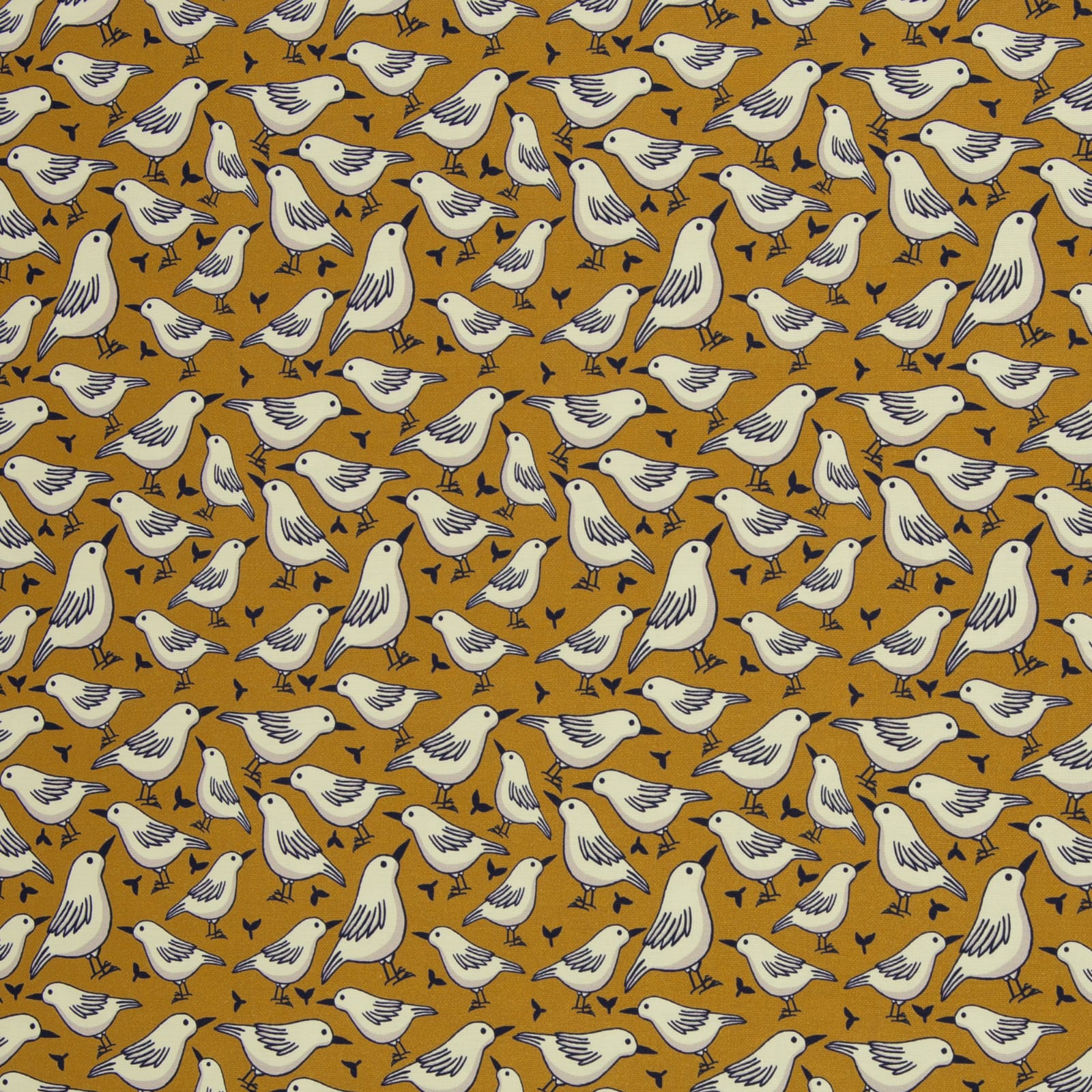 Der warme Senfton wirkt gemütlich und modern zugleich, während die kleinen gezeichneten Vögel dem Stoff eine wunderbar lebendige, aber trotzdem ruhige Ausstrahlung geben. Durch den festen Baumwoll-Canvas hat dein Projekt sofort Stand – ohne steif zu wirken. Er lässt sich sauber zuschneiden, franst kaum und transportiert sich ganz entspannt unter der Nadel deiner Haushaltsmaschine.
