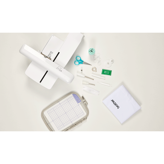 Stickfuß Q (montiert) • Nadelsatz • 4 Spulen (1 eingesetzt) • Pfeiltrenner • Schere • Reinigungspinsel • Schraubendreher groß & klein • scheibenförmiger Schraubendreher • Garnrollenkappen (groß, mittel montiert, klein) • Garnrolleneinsatz Mini-King • Spulennetz • Spulenkapsel ohne Schraubenmarkierung (montiert) • Stickrahmen 18 × 13 cm • Stickunterfaden (Stärke 90, weiß) • Zubehörtasche • Stoffhaube • Bedienungsanleitung • Kurzanleitung • Stickmuster-Katalog
