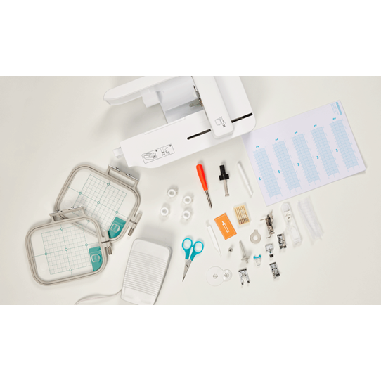 Zickzackfuß J (montiert) • Nähfuß N • Überwendlichfuß G • Reißverschlussfuß I • Blindstichfuß R • Knopfannähfuß M • Knopflochfuß A • Stickfuß Q • Nadelsatz • Zwillingsnadel • Spule (montiert) • 4 aufgewickelte Spulen (Unterfaden Stärke 60) • Spulenringe x4 • Pfeiltrenner • Schere • Reinigungspinsel • Ahle • Schraubendreher • Scheiben-Schraubendreher • zusätzlicher Garnrollenstift • Garnrollenkappen (groß, mittel montiert, klein) • Garnrolleneinsatz Mini-King • Spulennetz • Spulenkapsel (montiert) • Fußpedal • Stickrahmenset 10 × 10 cm • Zubehörtasche • Harthaube • Schablonensatz • Bedienungsanleitung • Kurzanleitung • Stickmuster-Katalog