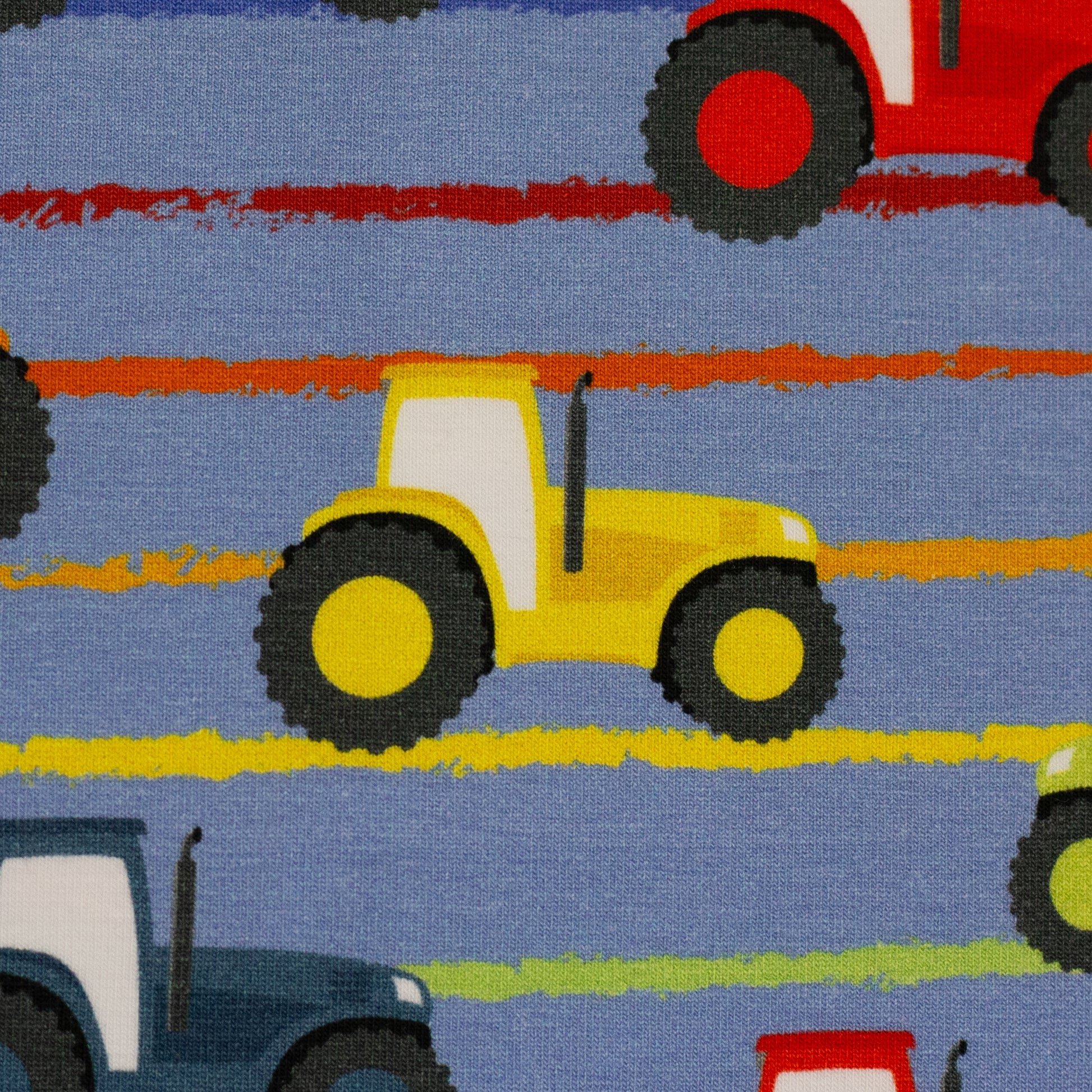 dieser Jersey bringt Kinderaugen garantiert zum Leuchten! Über den Stoff tuckern bunte Trecker fröhlich ihre Bahnen – wie ein Sommertag auf dem Land, wenn auf den Feldern gearbeitet wird und man am liebsten stundenlang zuschauen möchte. Der leicht strukturierte Hintergrund gibt dem Design Bewegung, ohne unruhig zu wirken. Genau die richtige Mischung aus verspielt und angenehm ruhig, sodass die Kleidung zwar auffällt, aber trotzdem jeden Tag tragbar bleibt.
