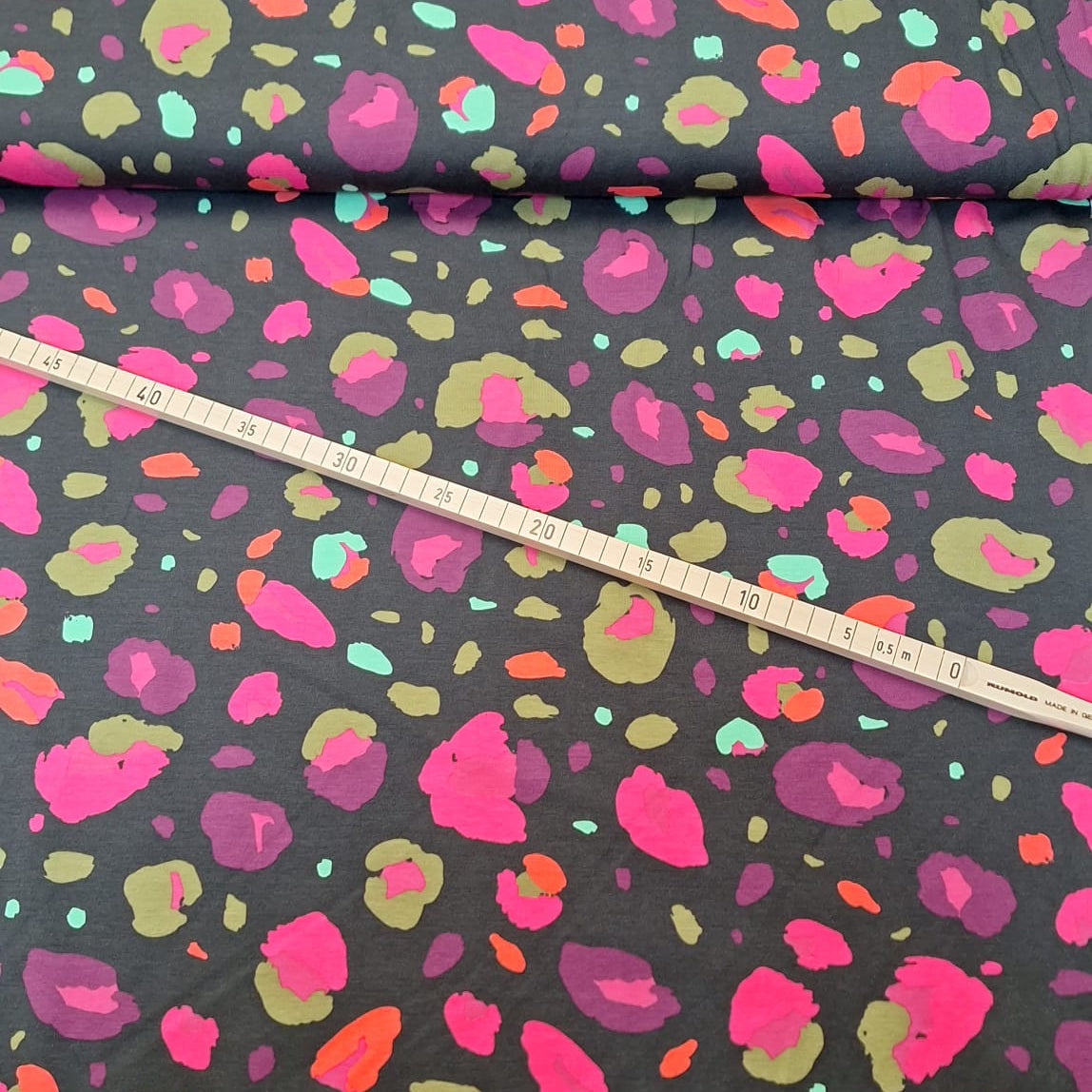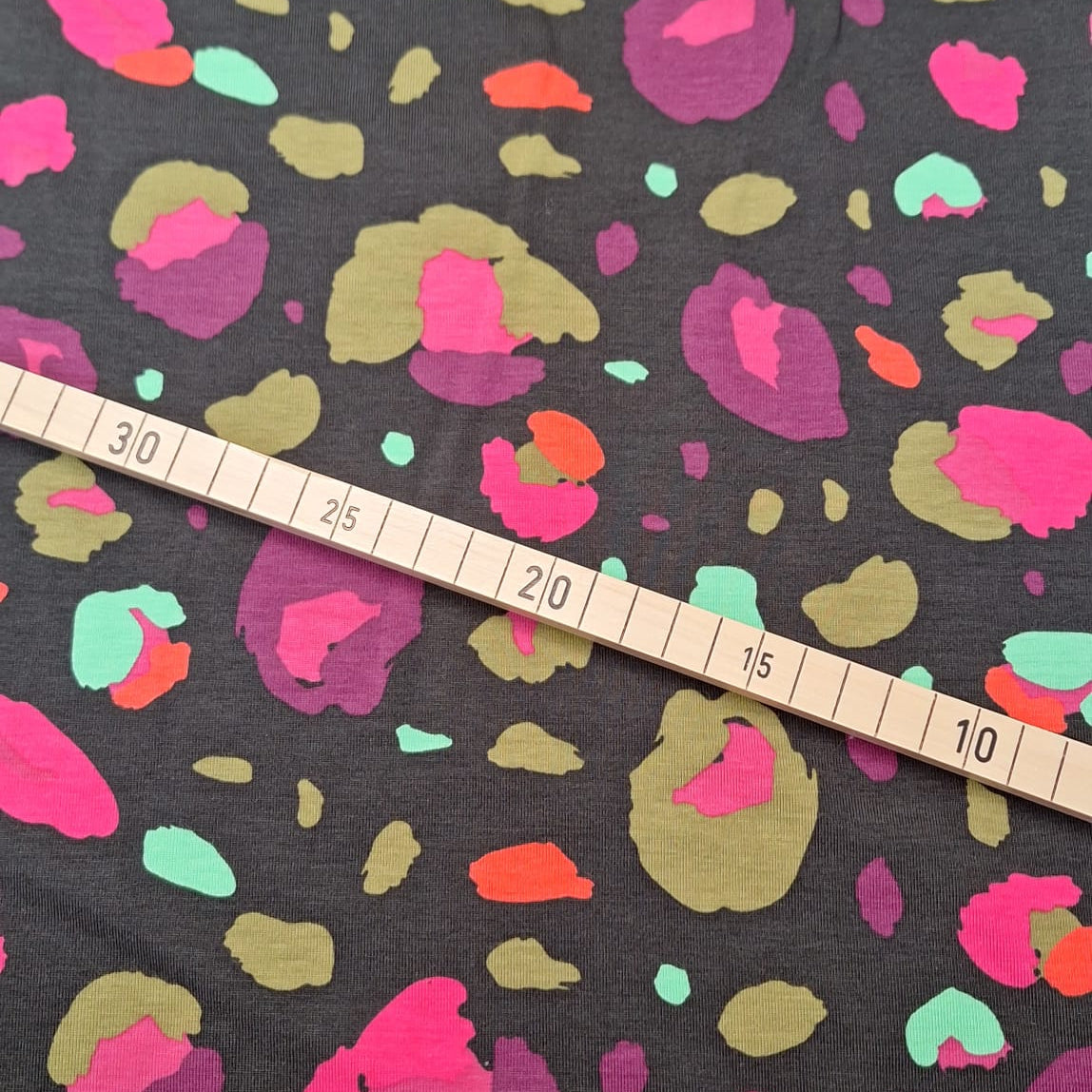 Bereit für Farbe, die Funken sprüht? Dieser außergewöhnliche Jersey vereint leuchtende Fleckenoptik mit dezenter Animal-Anmutung – modern, verspielt und absolut trendtauglich! Perfekt für alle, die Kleidung nähen möchten, die sofort gute Laune macht. 🌈🧵💕