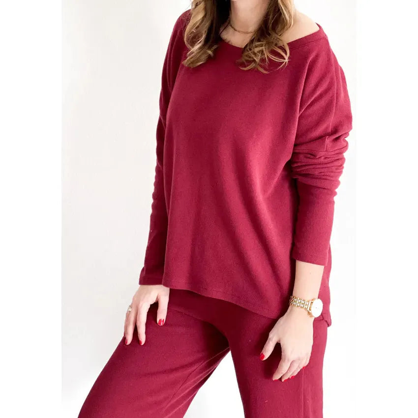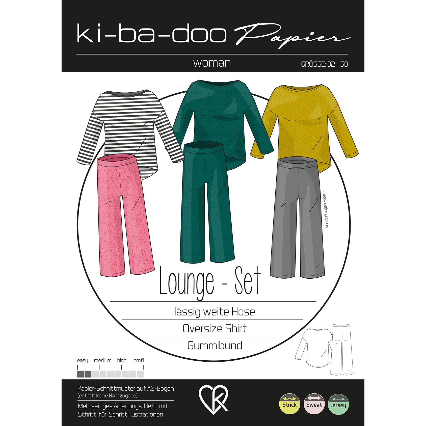 Das Lounge Set ist ein tolles Set und vielseitig einsetzbar. Ob gemütlich zuhause auf der Couch oder zusammen mit einer Bluse als Business-Look gestylt. Die Hose ist gerade und weit am Bein geschnitten. Am Bund sitzt sie figurnah und eher auf Taillenhöhe. Der Pullover hat überschnittene Schultern und einen großen uboot-förmigen Ausschnitt. Dieser lässt sich auch super off-shoulder tragen. Der Pulli ist leger geschnitten, aber die Ärmel sind dennoch eher schmal, der gebogene Saum rundet alles ab. Der Schnitt ist für elastische Stoffe wie Strick konzipiert.