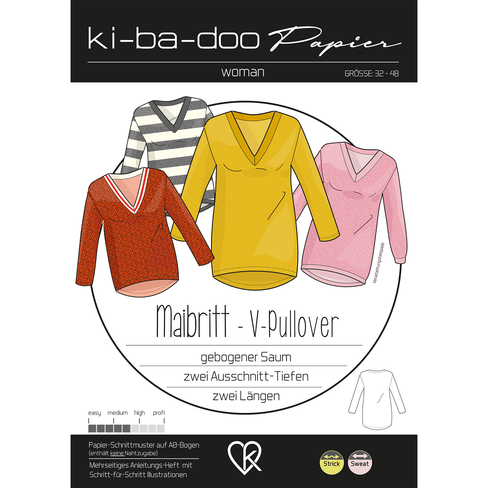 Maibritt ist ein lässig geschnittener V-Pullover in zwei verschiedenen Längen. Die Passform ist körperumspielend, die lange Länge ist perfekt zu schmalen Hosen oder Leggings. Der Saum ist leicht gebogen und gibt so eine tolle Silhouette. Es gibt zwei verschiedene Ausschnitttiefen und die Möglichkeit, mit oder ohne Bündchenversäuberung zu nähen. Zusätzlich zum klassischem V-Halsbündchen gibt es ein Schnittteil extra für fertige Bündchenstreifen (Cuffs).