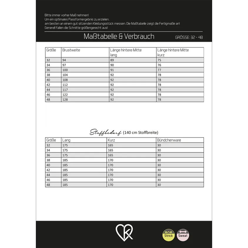 Dieses Set enthält alle Schnittmusterteile in den Größen 32-48 in Farbe auf einem DIN A0 Bogen und eine ausführlich bebilderte Nähanleitung als DIN A4 Broschüre. Unsere Schnittmuster sind auf einem DIN A0 Bogen gedruckt. Je nach Anzahl und Grösse der Schnittmuster überlagern sich diese und müssen kopiert werden. Die Nahtzugabe ist nicht enthalten.