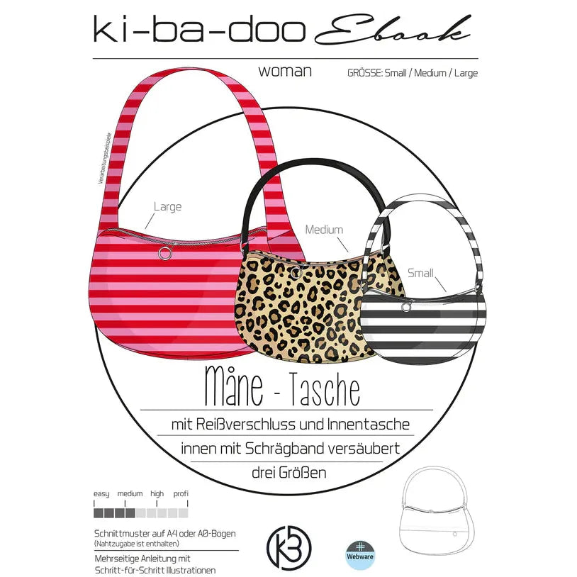 Erhältlich in drei Größen (S, M, L), bietet das Schnittmuster unzählige Möglichkeiten zur Gestaltung. Durch die saubere Schrägbandversäuberung bleibt die Tasche formstabil – ganz ohne kompliziertes Verstürzen. Innen- und Außentaschen schaffen zusätzlichen Stauraum, während der Reißverschluss deine Schätze sicher verwahrt.
