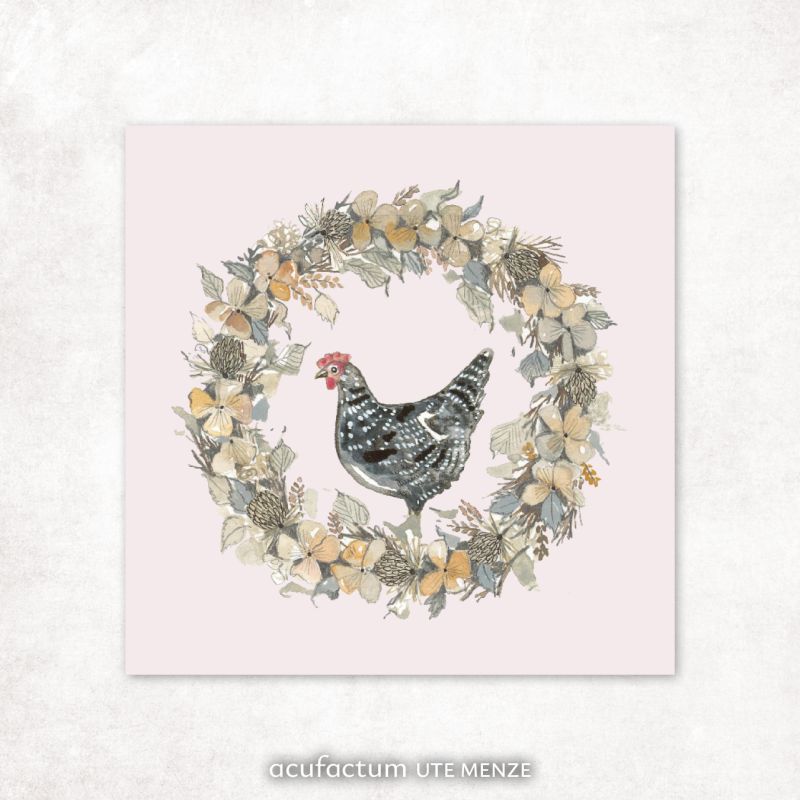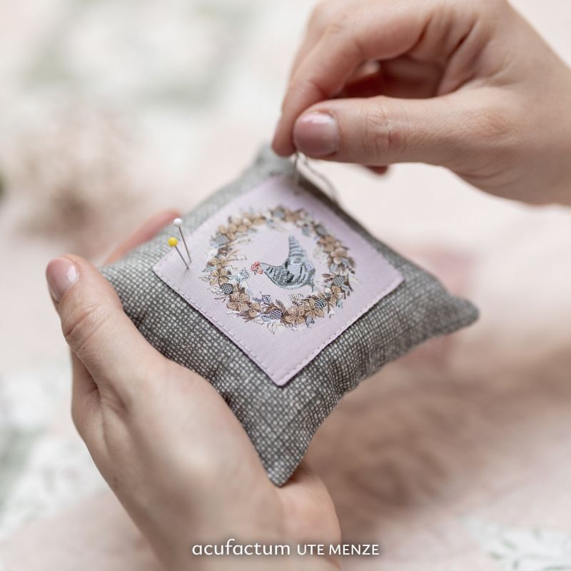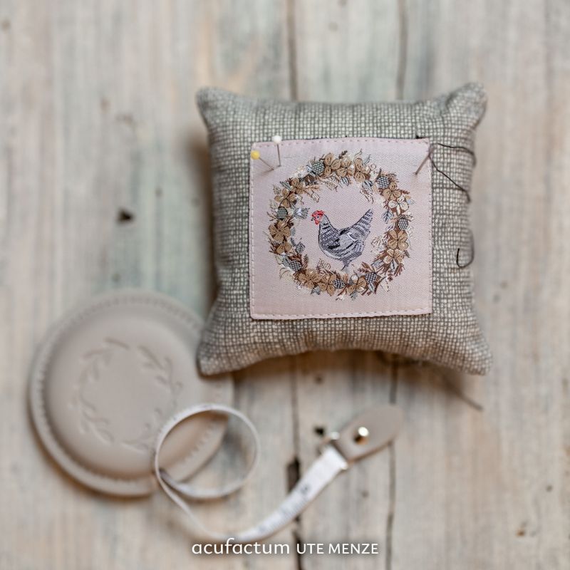 Das fröhliche Huhn, umrahmt von einem zarten Blütenkranz, wirkt wie aus einem liebevollen Landgarten entsprungen. Die feinen Illustrationsdetails von Kerstin Heß bringen sofort diese ruhige, natürliche Stimmung in dein Nähprojekt — ein bisschen Bauernhofidylle, ein bisschen Hygge und ganz viel Handmade-Charme.