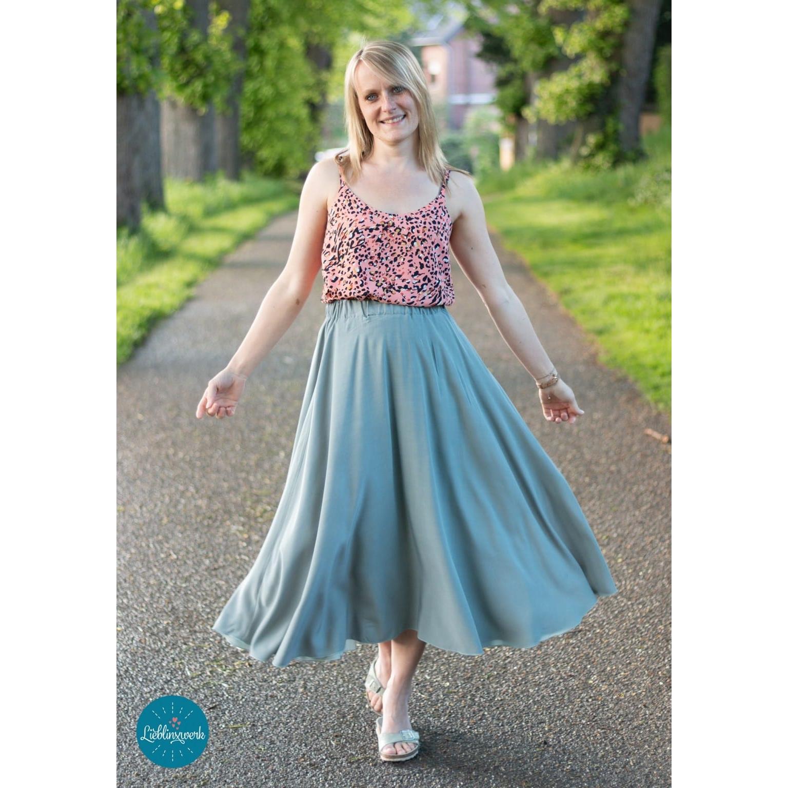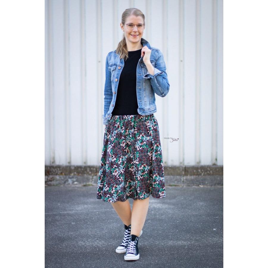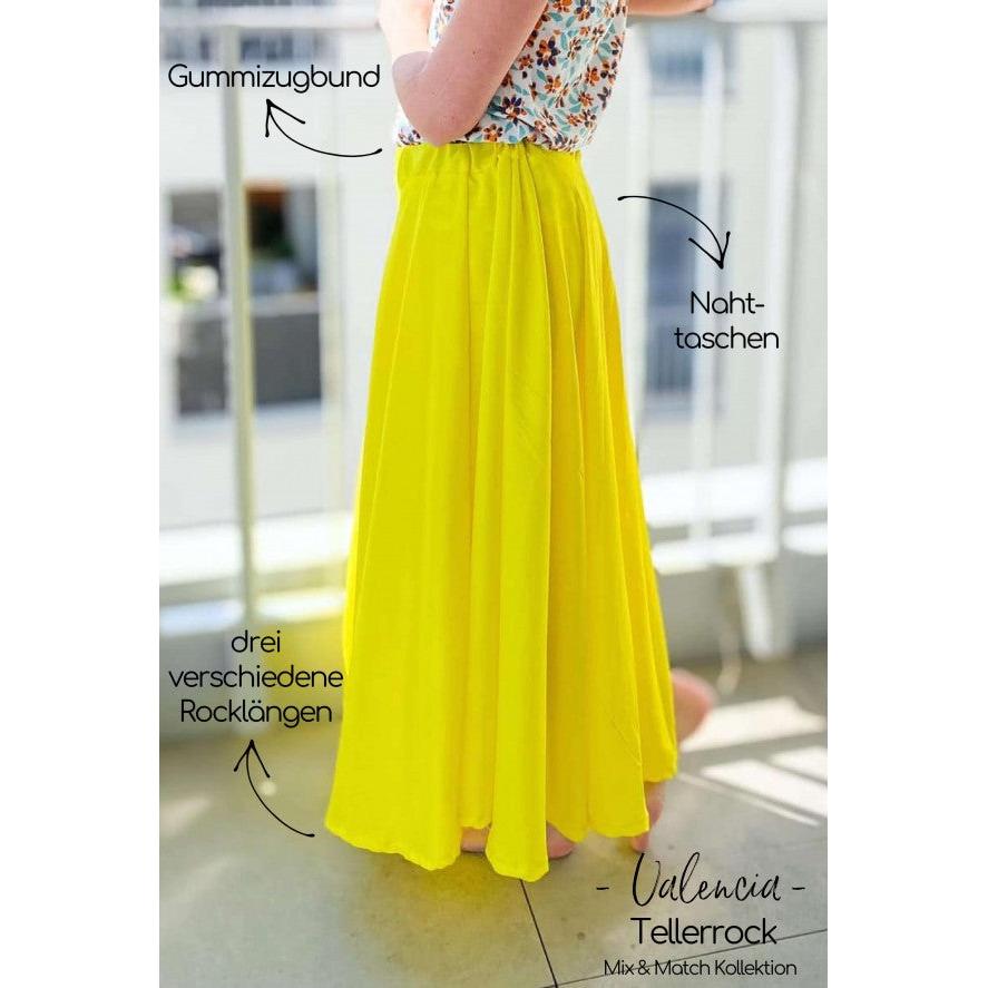 Mit Valencia nähst Du Dir einen Rock, der bei jeder Bewegung mitschwingt. Der klassische Tellerrock sitzt leicht, fällt wunderschön und macht sofort Sommerlaune – egal ob kurz, knielang oder knöchellang.
