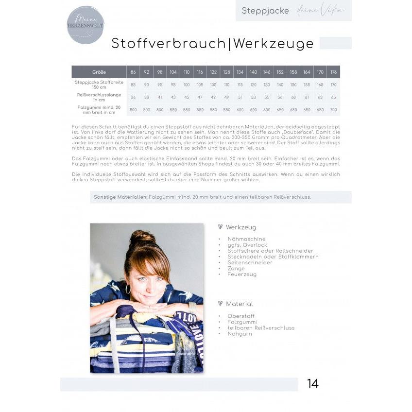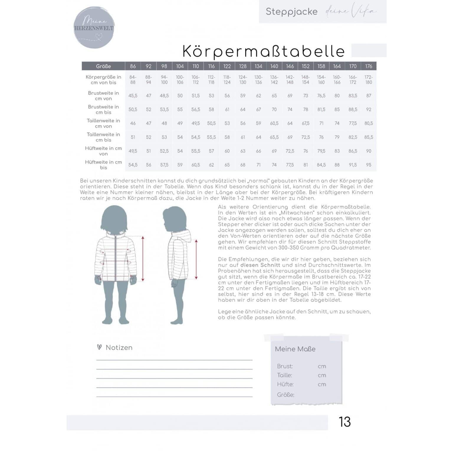 Das Papierschnittmuster deckt Größe 86–176 ab und enthält eine gut verständliche, bebilderte Anleitung – ideal auch für Näherinnen, die sich zum ersten Mal an eine Steppjacke wagen. So entsteht Schritt für Schritt eine robuste Lieblingsjacke, die warmhält und echt was aushält.